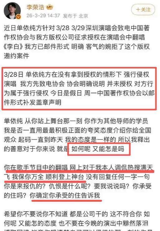 李荣浩这回然而真动了怒火,大周末的连发数条动态,奏凯把锋芒瞄准了单依纯。启事倒也节略,单依纯在演唱会上私自改编并演唱了《李白》,这事儿让老李积压已久的动怒透顶爆发。其实早前作品被魔改时他就心里堵得慌,为了顾全对方好意思瞻念一直没吭声,谁知此次对方竟变本加厉。