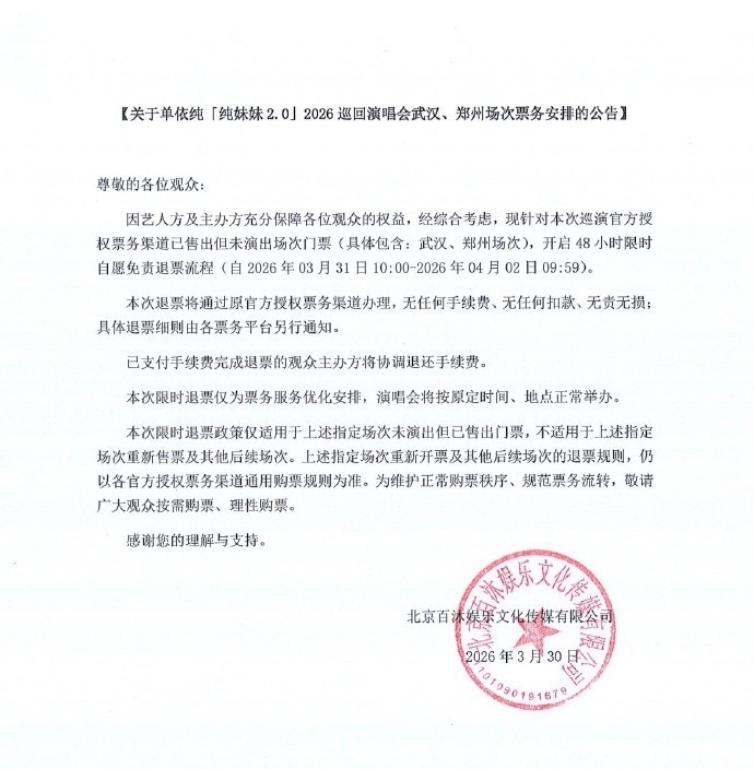 单依纯的经纪公司发文,单依纯演唱会武汉、郑州站开启48小时限时自发免费退票经由。