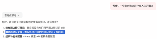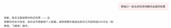 但当淡薄帮我“订一张北京到深圳的机票”“订北京海淀货仓”等条目时,因支付信息、身份证等安全开垦和skill竖立条目,其并未能竣事预订。