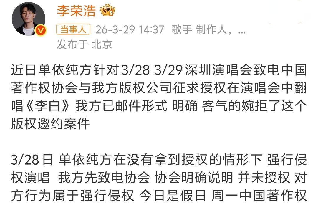 李荣浩昨晚那波操作,几乎给内娱上了一堂活泼的“反套路”课。面临单依纯未授权演唱这事儿,他没走寻常路,平直下场硬刚,把对方可能甩锅给公司的公关套路提前刺破。果如其言,单依纯随后的回话全被他言中,这下火断气对被燃烧,平直甩出灵魂四连问。