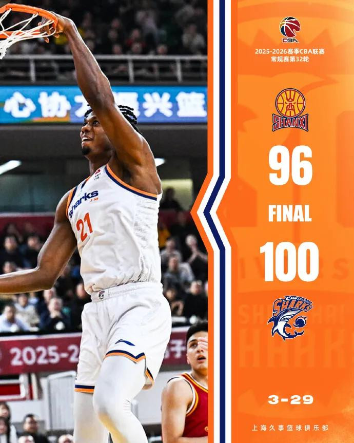 96-100,山西队主场惜败上海队。